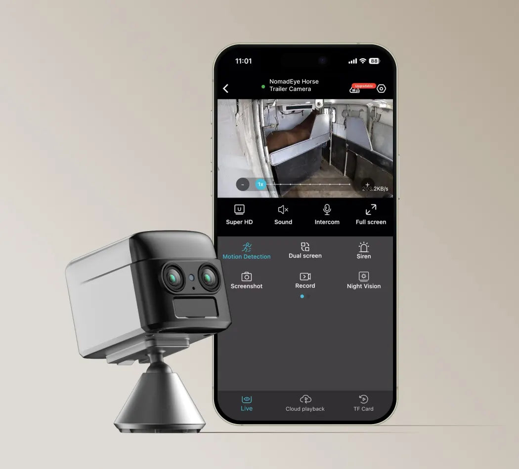 Traveling with horses can be stressful. The NomadEye trailer camera provides a reliable, wireless video feed directly from inside your trailer to your smartphone app,