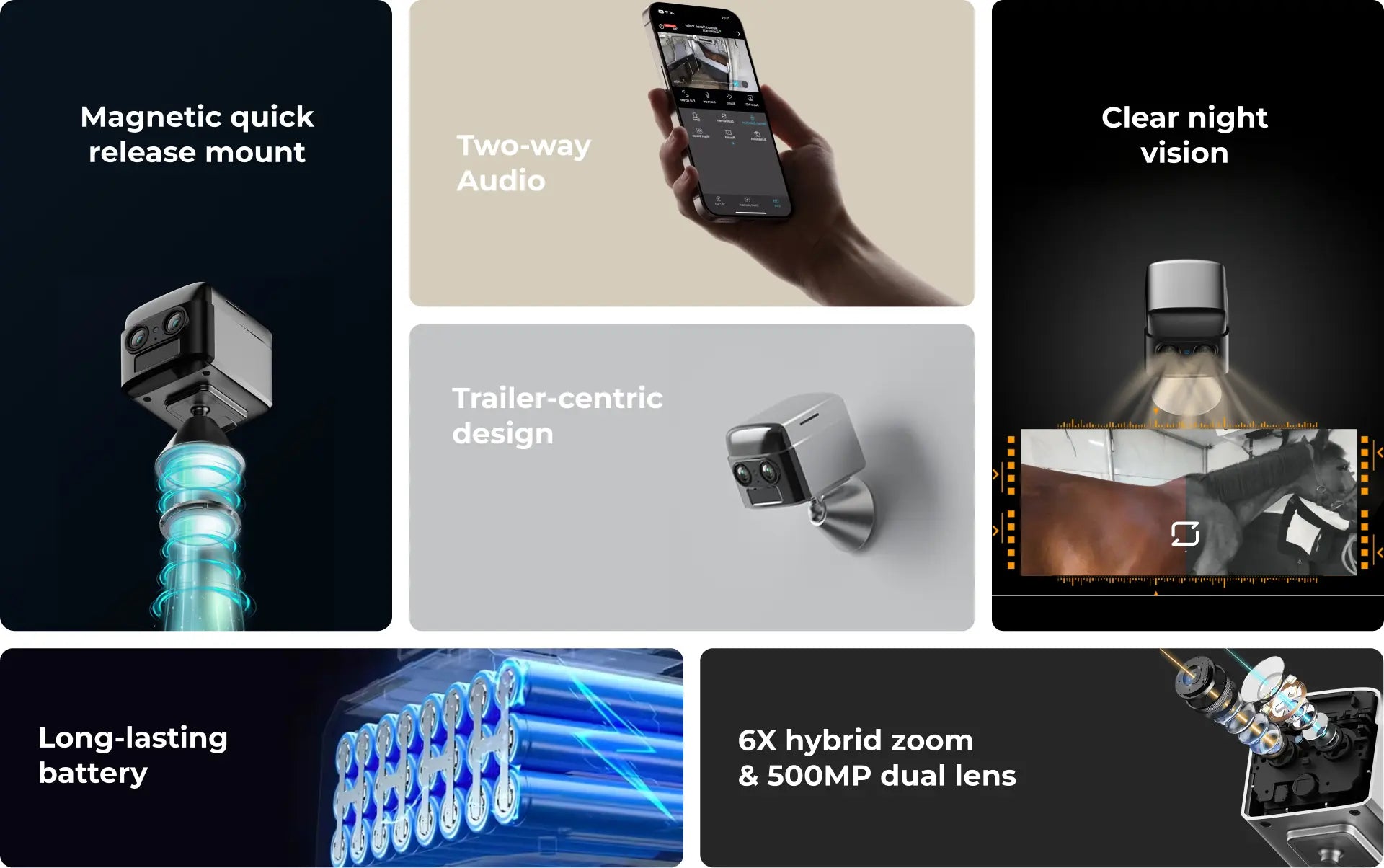 4K dual-lens clarity with 6x hybrid zoom lets you monitor every corner of your horse trailer in sharp detail.